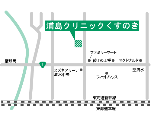 国道一号線を利用する場合:楠新田東の交差点を北方向に曲がり、150mほど直進。